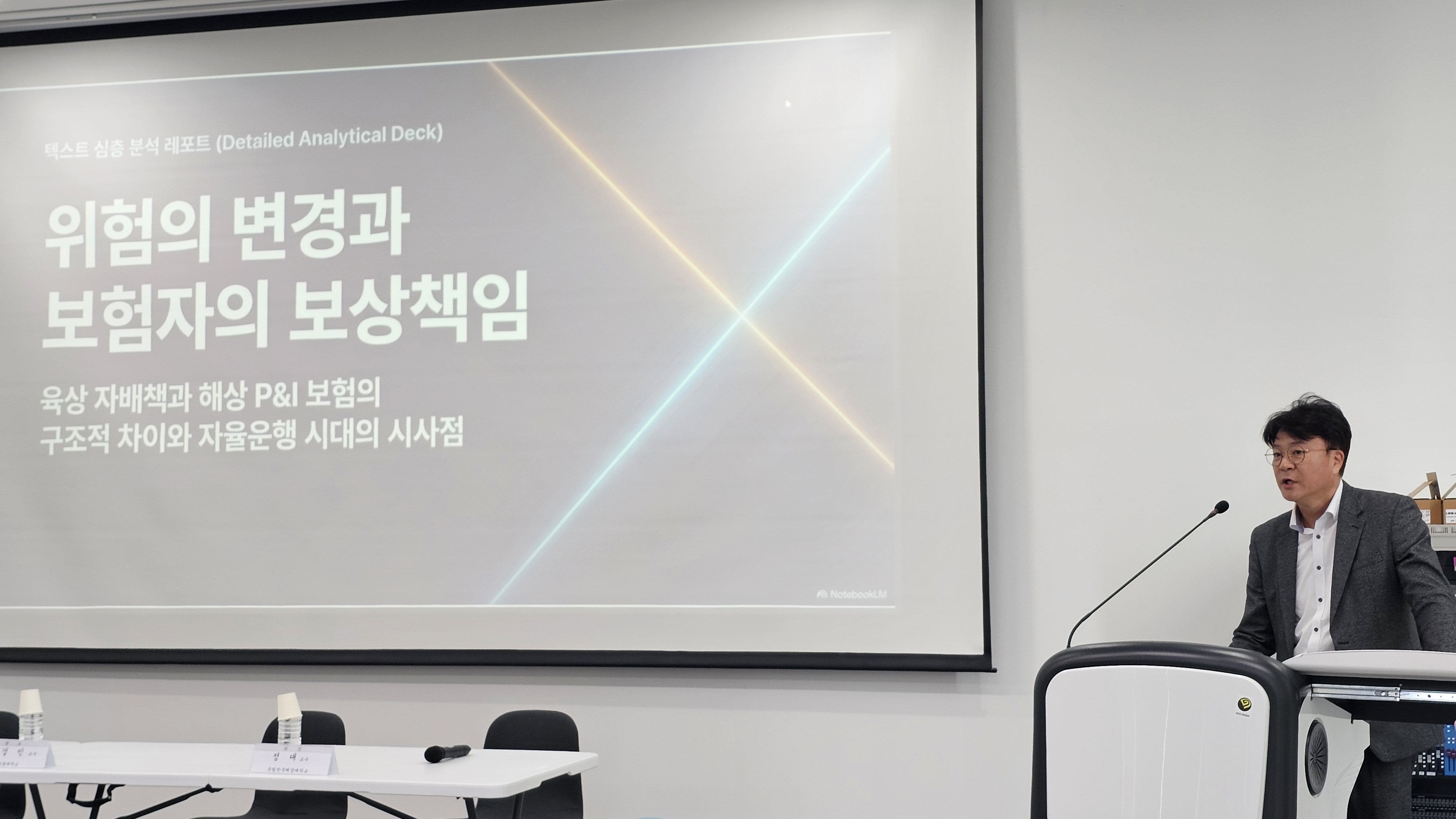 제1세션에서는 정대 교수(한국해양대)를 좌장으로 발제 및 토론을 진행하였다. 박문학 변호사(법무법인 세진)가 ‘해사국제상사법원의 도입과 상법상 복합운송책임 체계’를, 이경민 교수(원광대)가 ‘육상 자배책과 해상 P&I 보험의 구조적 차이와 위험 변경에 따른 보상 책임’을 발표했다.